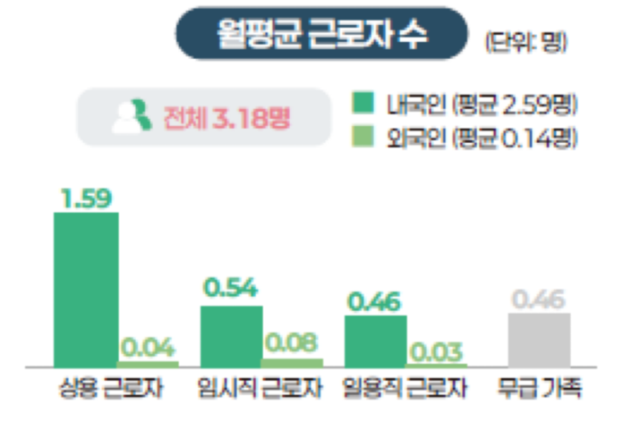 이와 함께 주목할 변화는 ‘가족 노동’의 확대다. 외식업체의 월평균 근로자 수는 3.18명 수준이며, 이 중 무급 가족 종사자가 일정 부분을 차지하고 있다. 무급 가족 종사자는 월평균 0.46명 수준으로, 인건비 부담을 줄이기 위한 현실적 대안으로 활용되고 있는 모습이다.