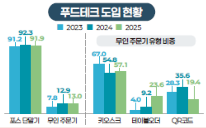 무인 주문기와 테이블 오더 도입은 빠르게 확산되고 있다. 무인 주문기 도입 비중은 2023년 7.8%에서 2025년 13.0%로 증가했고, 그중 테이블 오더는 4.0%에서 23.6%로 급증하며 매장 내 주문 방식이 비대면 중심으로 재편되고 있다.
