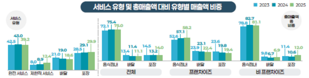 서비스 방식에서도 변화가 나타난다. 완전한 테이블 서비스 비중은 줄어드는 반면, 셀프 서비스나 제한적 서비스 형태는 증가하고 있다. 이는 인건비 절감과 운영 효율화를 동시에 추구하는 변화로 볼 수 있다.