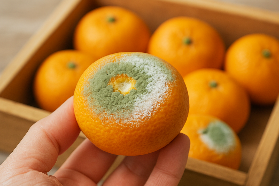 겨울철 대표 과일인 귤도 예외가 아니다. 껍질이 얇고 수분이 많아 푸른곰팡이와 녹색곰팡이가 쉽게 번식한다. 한 알이라도 곰팡이가 피면 인접한 귤로 포자가 옮겨가 상자 전체를 오염시킬 수 있다. 눈에 띄는 곰팡이만 제거해도 공기 중에 남은 포자가 피부 발진, 비염, 천식 등을 악화시킬 수 있으므로 곰팡이가 핀 귤과 주변 귤은 반드시 폐기해야 한다.