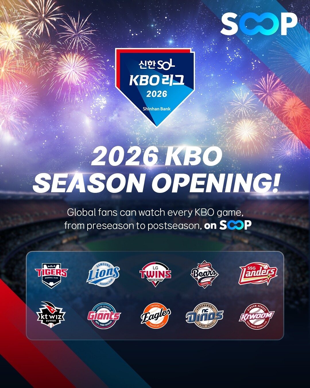 [Cook&Chef = 조용수 기자] SOOP이 2026 KBO 리그 전 경기를 한국을 제외한 해외 전 지역에 생중계한다. 시즌 전 각 구단의 해외 전지훈련 연습경기 중계를 이어온 SOOP은 오는 28일(토) 개막하는 정규시즌을 포함해 한국시리즈까지 2026년 KBO 리그 전 경기를 제공할 예정이다. 해외 유저들은 누구나 라이브 스트리밍 플랫폼 SOOP(www.sooplive.com)을 통해 3월부터 9월까지 KBO 리그 전 경기를 실시간으로 시청할 수 있다.