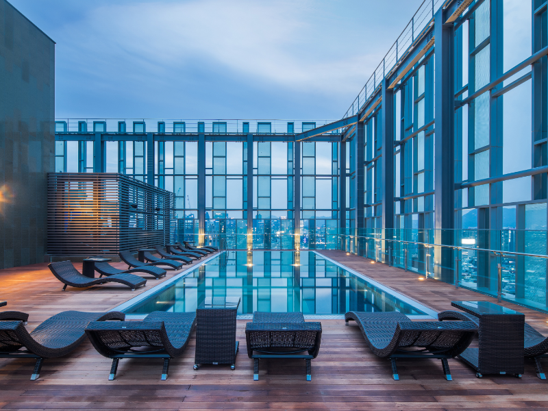 호텔 최상층에 위치한 실외 루프톱 수영장은 탁 트인 도심 전망을 감상하며 여유로운 휴식을 즐길 수 있는 공간이다. 낮에는 따뜻한 봄 햇살을 느끼며 휴식을 취하고 밤에는 서울의 야경과 함께 색다른 분위기를 경험할 수 있다. 특히 봄 시즌에는 온수풀로 운영되어 다소 선선한 날씨 속에서도 따뜻하게 수영을 즐길 수 있어 투숙객들에게 꾸준한 인기를 얻고 있다. 다만 보다 안전하고 쾌적한 이용 환경을 위해 19세 이상 성인 전용 시설로 운영되며 호텔 투숙객에 한해 이용 가능하다.