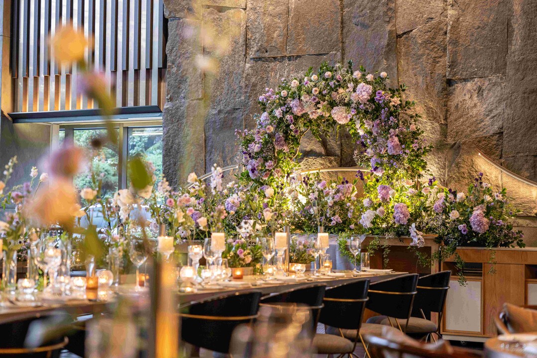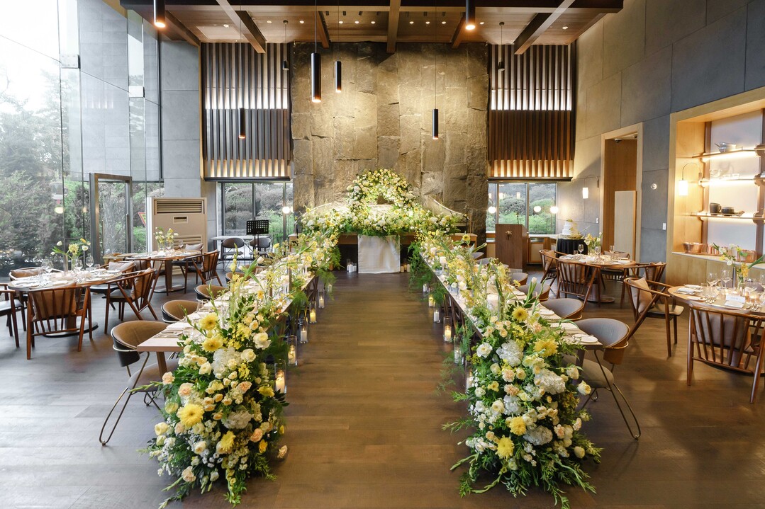 그라넘은 천장부터 바닥까지 내려오는 전면 통유리창을 통해 자연광이 가득 들어오는 공간이다. 벽면은 중후한 화강함으로 마감돼 클래식하고 모던한 무드를 자아내며, 은은한 캔들 라이트와 플라워 데커레이션이 더해진다. 특히 좌석은 예비 부부의 입장 동선을 중심으로 바 테이블 형태로 배치되어 하객과의 거리감을 줄이고, 세리머니에 집중할 수 있는 구조로 설계된다. 플라워 콘셉트 역시 호텔 내 전문 플로리스트와의 상담을 통해 계절과 테마에 맞는 맞춤형 스타일링이 가능하다. 식사는 그라넘의 양식 코스 메뉴로 제공되며, 하객들에게 품격 있는 미식 경험을 선사한다.