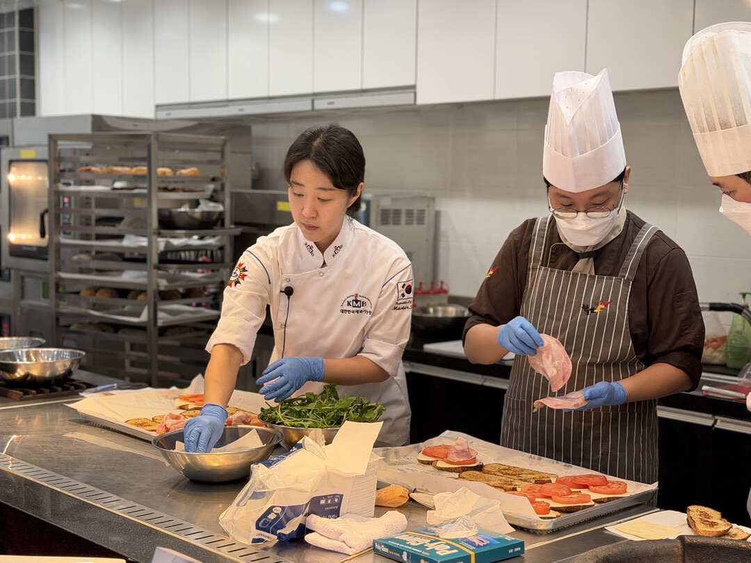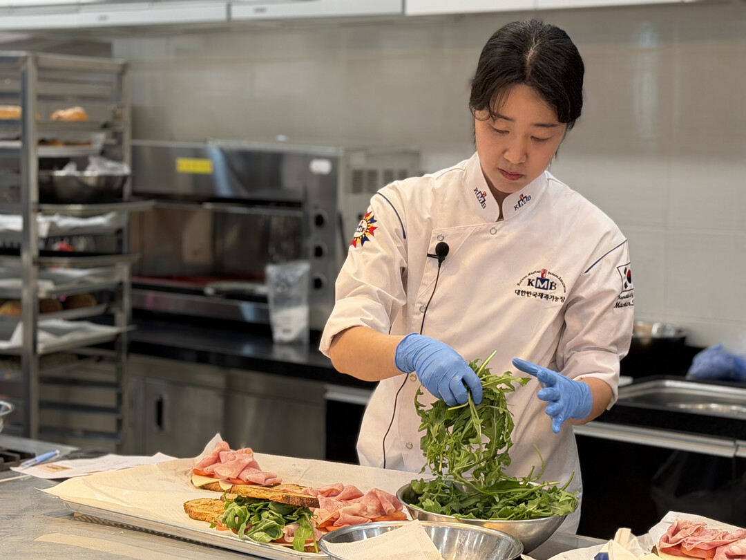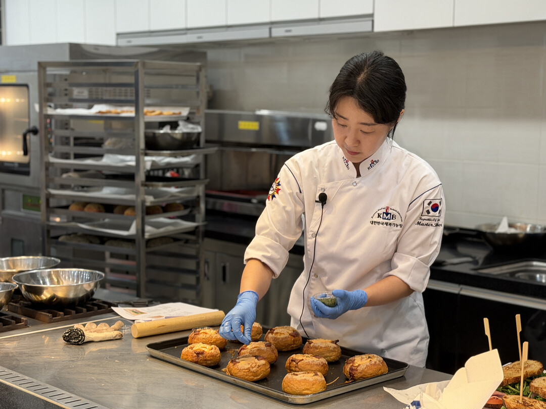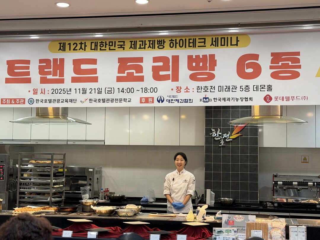 [Cook&Chef = 안정미 기자] 한호전(한국호텔관광실용전문학교) 호텔제과제빵과 11학번 윤지연 동문이 모교를 찾아 재학생들을 위한 하이테크 세미나를 진행했다. 이번 세미나는 지난 11월 21일(금) 한호전 데몬홀에서 열렸으며, 호텔제과제빵과 재학생 200여 명이 참석해 성황을 이뤘다. 현재 대한민국 대표 베이커리 브랜드인 성심당 DCC점에서 파티시에로 근무 중인 윤지연 동문은, 현장에서의 실무 경험을 바탕으로 최근 베이커리 업계에서 주목받는 트렌드 빵 6종을 직접 시연했다. 반죽 준비부터 발효, 굽기, 마무리 데코레이션에 이르기까지 한 제품이 완성되기까지의 전 과정을 세밀하게 보여주며, 재학생들이 실제 매장 환경을 보다 생생하게 이해할 수 있도록 도왔다.