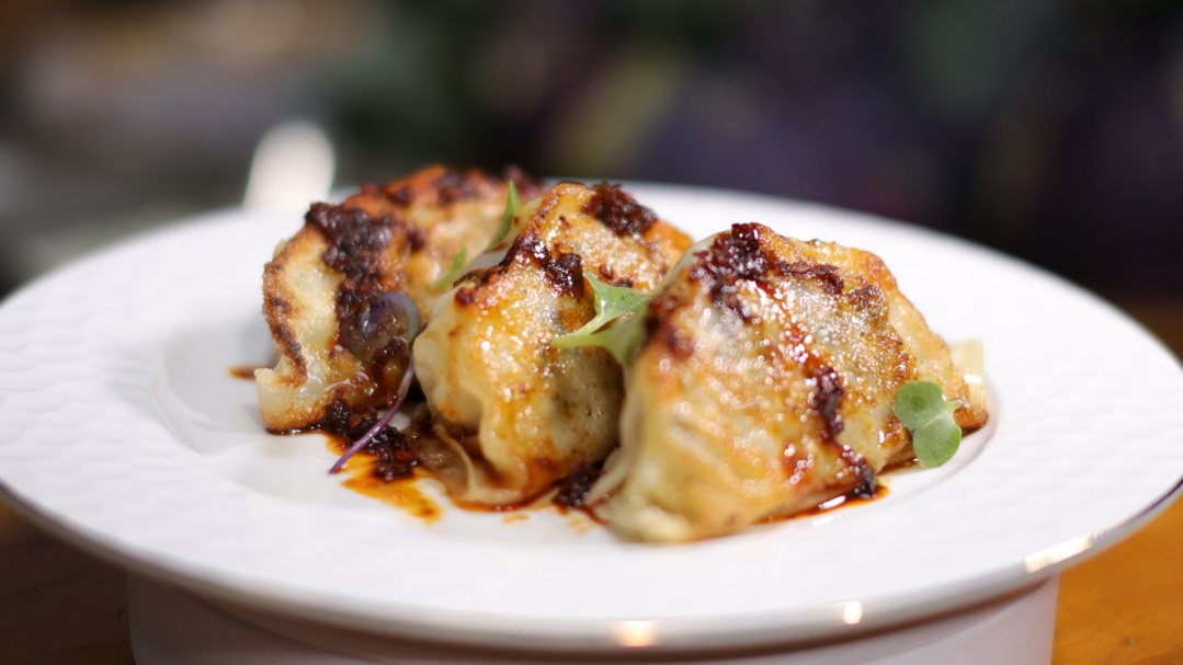 4. 팬에 기름을 두르고 3의 만두를 한쪽 면만 노릇노릇하게 지져 접시에 담아 콜라비 쪽파 만두를 완성한다.