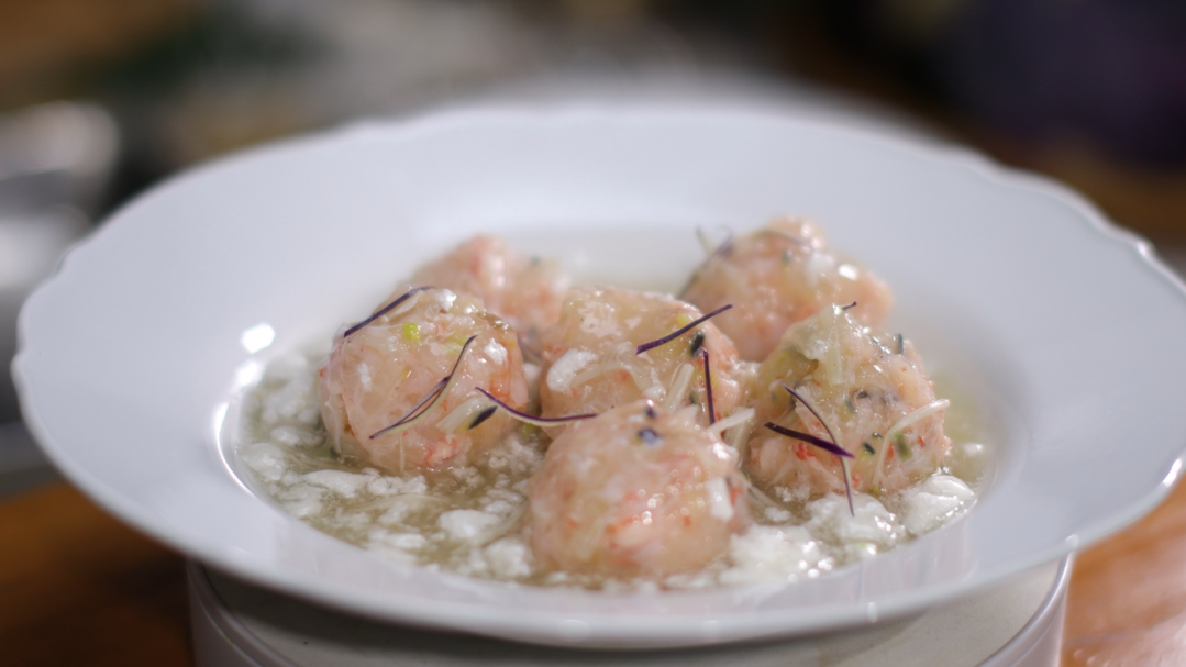 1. 얇게 채 썬 콜라비에 다진 새우살과 홍게 다리살을 넣고 찰기가 생기도록 치대어 한입 크기 완자 모양으로 만든 후 찜기에 8분간 쪄준다.