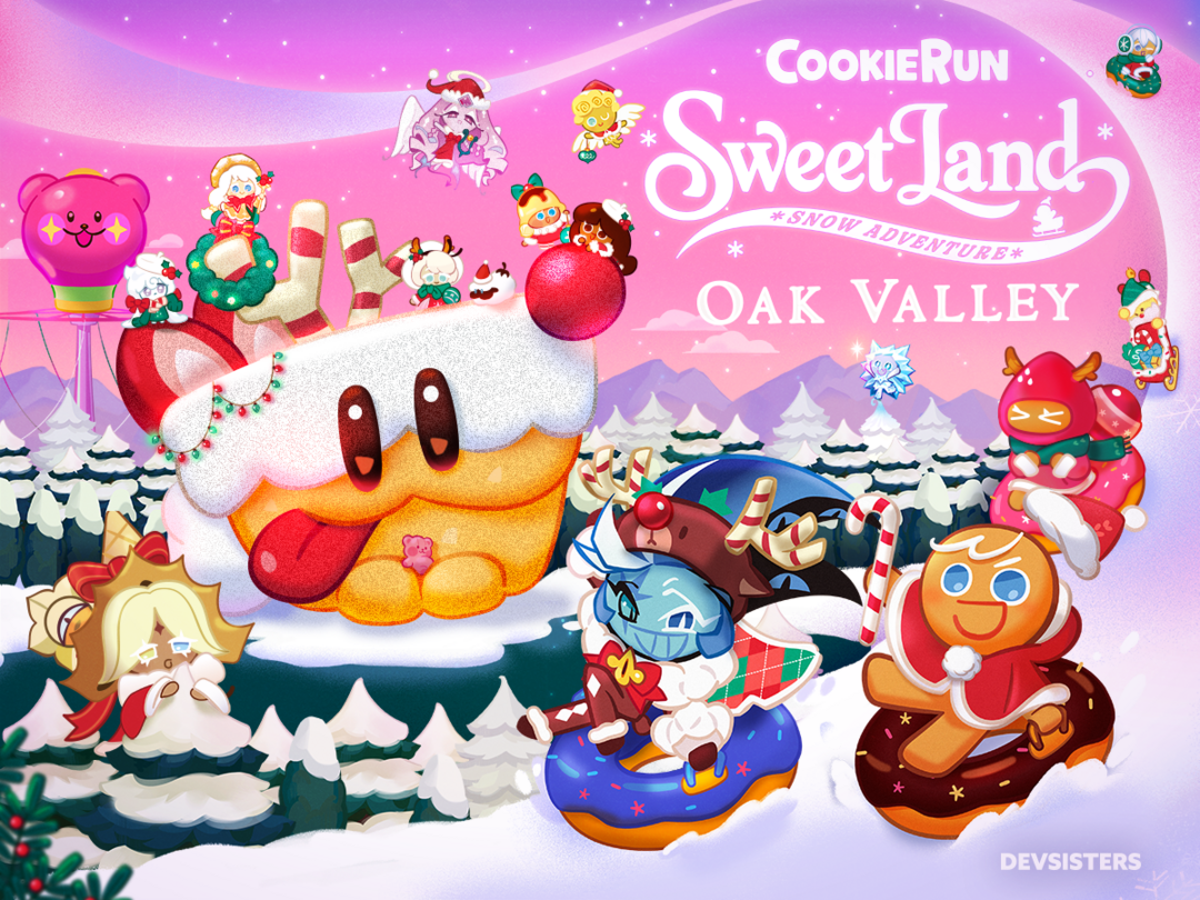 ‘쿠키런 스위트랜드’는 올겨울 오크밸리 리조트 ‘스노우 어드벤처’의 핵심 콘텐츠로 자리 잡는다. 오크힐스CC 페어웨이와 기존 눈썰매장 위치를 활용한 약 6천 평 규모의 탁 트인 공간에서 달리고, 놀고, 쉬며 다양한 추억을 쌓을 수 있는 겨울 체험형 콘텐츠로 구성된다. 쿠키런 전용 눈썰매장 3종, 쿠키런 플레이 그라운드, 쿠키런 스위트 라운지, 쿠키런 트리마을 등 4개의 메인 존을 포함해 총 14곳 이상의 체험 공간을 마련해 쿠키런의 세계관을 현실에서 생생하게 경험할 수 있도록 했다.