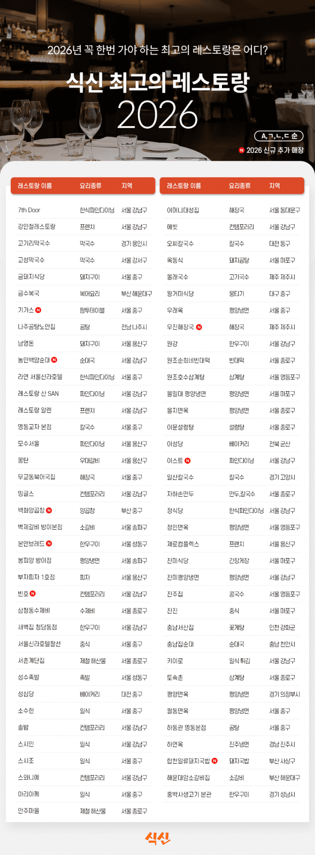‘더 테이블 레스토랑’에는 2,793곳이 이름을 올렸으며, 레브어, 일리조, 오르조부르텀, 스시한다, 스시타 등이 새롭게 선정됐다.