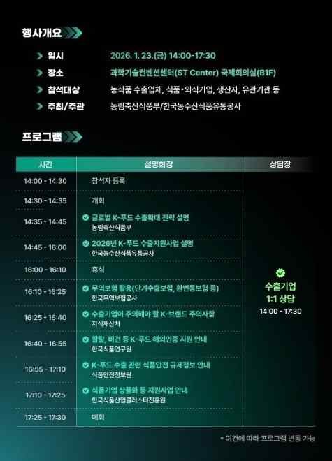 마지막으로, 현장과의 지속적인 소통이 중요하다. 이번 설명회에서 1:1 상담 부스를 확대한 것은 긍정적 신호다. 정책의 실효성은 현장의 의견을 수렴하고 지속적으로 보완할 때 확보된다. 정부의 강력한 의지와 산업 현장의 혁신 노력이 결합될 때, K-푸드는 글로벌 식품 산업의 주요 플레이어로 자리매김할 수 있을 것이다.