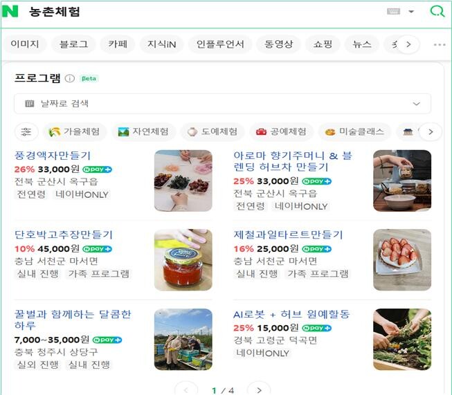 네이버 검색창에 ‘농촌체험’을 입력하면 화면 중간에 통합 정보창 ‘프로그램’이 보인다. 여기서 공기정화식물 화분 만들기, 제철 농작물 수확, 동물교감, 곤충 표본 체험 등 전국 42개 농장에서 운영 중인 다양한 프로그램 정보를 확인·예약할 수 있다.