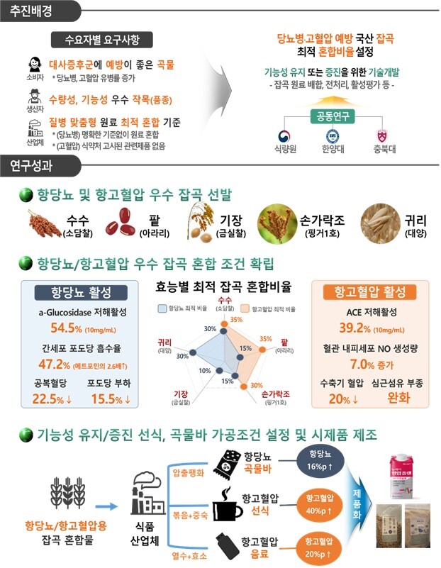 이에 농진청은 국내 주요 잡곡 가운데 항당뇨·항고혈압 활성이 우수한 품목을 선별하고 과학적 검증을 거쳐 최적의 혼합비율을 설정해 특허등록을 완료했다. 항당뇨용 혼합비율은 귀리 30%, 수수 30%, 손가락조 15%, 팥 15%, 기장 10%이며 항고혈압용 혼합비율은 손가락조 30%, 수수 35%, 팥 35%다.