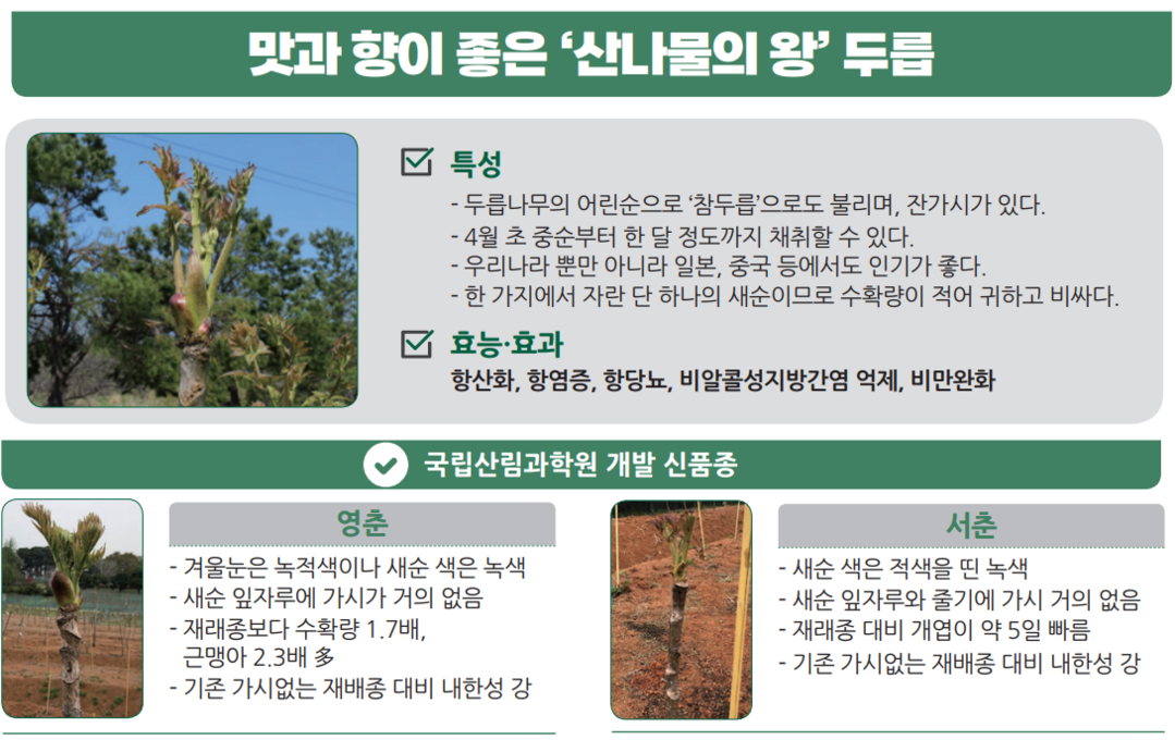 [Cook&Chef = 허세인 기자] 봄철 대표 산나물인 두릅의 재배 불편을 개선하고 생산성을 높인 신품종이 개발됐다. 산림청 국립산림과학원(원장 김용관)은 두릅나무 신품종 ‘서춘’과 ‘영춘’을 개발해 보급한다고 밝혔다. 이번 품종은 가시로 인한 작업 불편과 제한적인 수확 구조를 개선하는 데 초점을 맞췄다.
