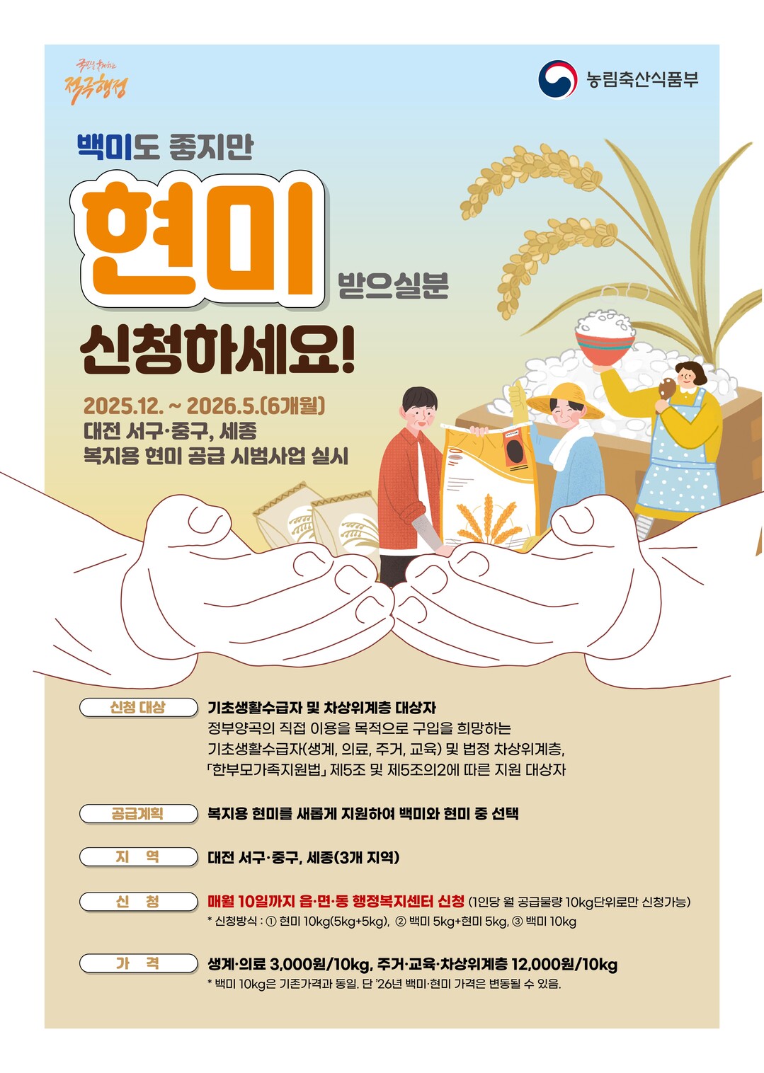 농림축산식품부(장관 송미령)는 국민(수요자) 중심 행정서비스 제공, 취약계층의 건강 증진과 먹거리 복지 강화 등을 위해 올해 12월부터 내년 5월까지 6개월간 ‘복지용 현미 공급 시범사업’을 대전 서구, 대전 중구, 세종시 3개 지역에서 시행한다고 25일 밝혔다.