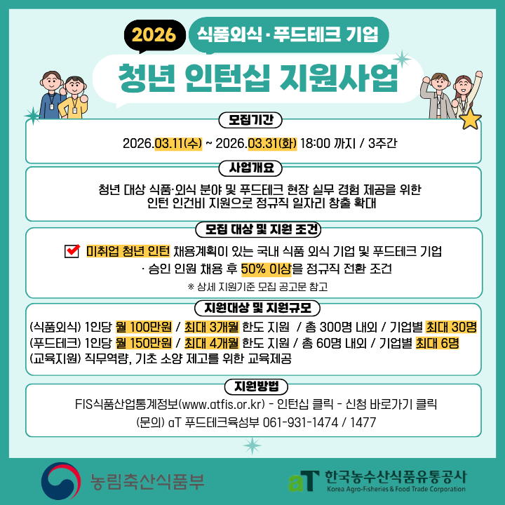 농림축산식품부(장관 송미령)와 한국농수산식품유통공사(aT, 사장 홍문표)는 ‘식품외식·푸드테크기업 청년 인턴십 지원사업’에 참여할 기업을 오는 31일까지 모집한다.