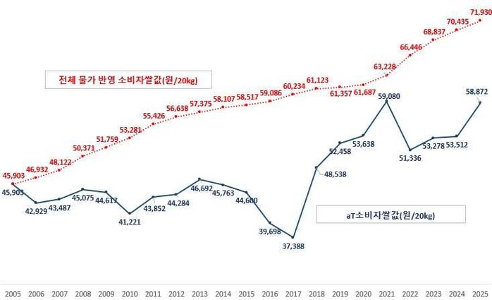 실제로 2021년부터 2024년까지 연평균 소비자쌀값은 2020년 수준보다 낮게 형성됐다. 장기 시계열 분석 결과, 지난 20년간(2005~2025 회계연도) 전체 소비자물가지수가 56.7% 상승하는 동안 쌀 소비자물가지수는 45.7% 상승에 그쳤다. 쌀 가격이 타 물가 대비 상대적으로 더디게 올랐다는 의미다. 이 데이터는 현재 쌀 가격을 ‘급등’보다 ‘회복’으로 봐야 한다는 정부 시각을 뒷받침한다.