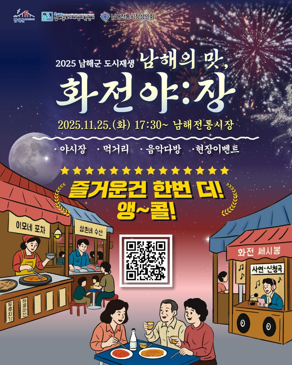 한편, 남해군도시재생지원센터는 지난 10월 28일 큰 호응을 얻었던 ‘화전야:장’의 성원에 힘입어 오는 11월 25일 오후 5시 30분 남해전통시장에서 ‘남해의 맛–화전야:장(花田夜:場) 앵콜전’을 개최한다.
