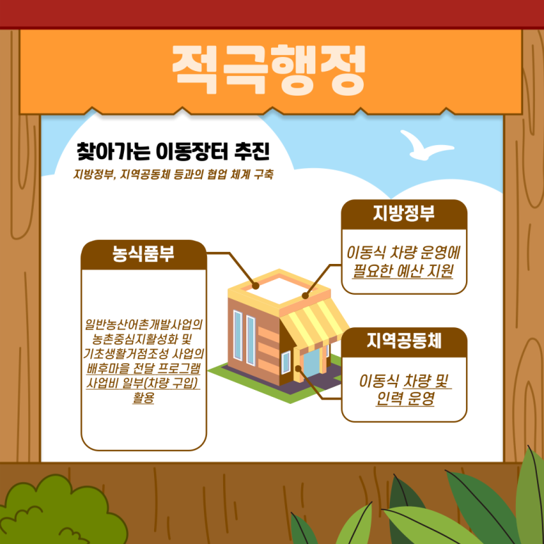 이 같은 문제에 대응해 농림축산식품부는 2024년부터 ‘찾아가는 이동장터’ 사업을 추진하고 있다. 농촌 취약마을을 대상으로 식료품과 생필품을 직접 배달·판매하는 방식으로, 소매점이 없는 지역 주민들의 생활 불편을 줄이는 데 기여하고 있다. 실제로 전남 함평군 등 시범지역에서는 이동장터를 통해 장보기 부담이 완화되는 효과가 나타났다.