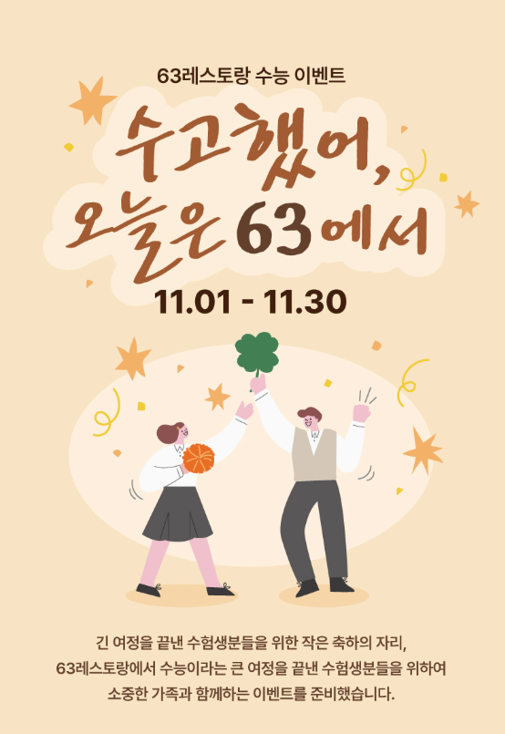 모든 혜택은 사전 예약 고객에 한해 적용되며, 수험표와 신분증을 지참한 본인만 이용할 수 있다. 자세한 내용은 63레스토랑 공식 홈페이지에서 확인 가능하다.