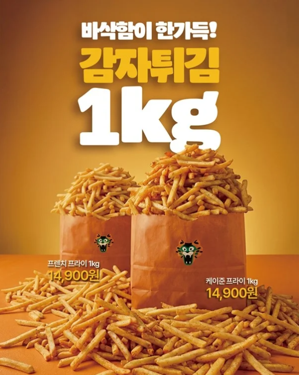 대표 메뉴는 ‘1㎏ 메가 감자튀김’이다. 종이 포대에 담긴 대용량 감자튀김을 사이드가 아닌 메인 메뉴로 제안하며 시각적 재미를 강조했다. 이와 함께 크리스피 감자버거 등 감자 기반 메뉴도 함께 출시됐다.