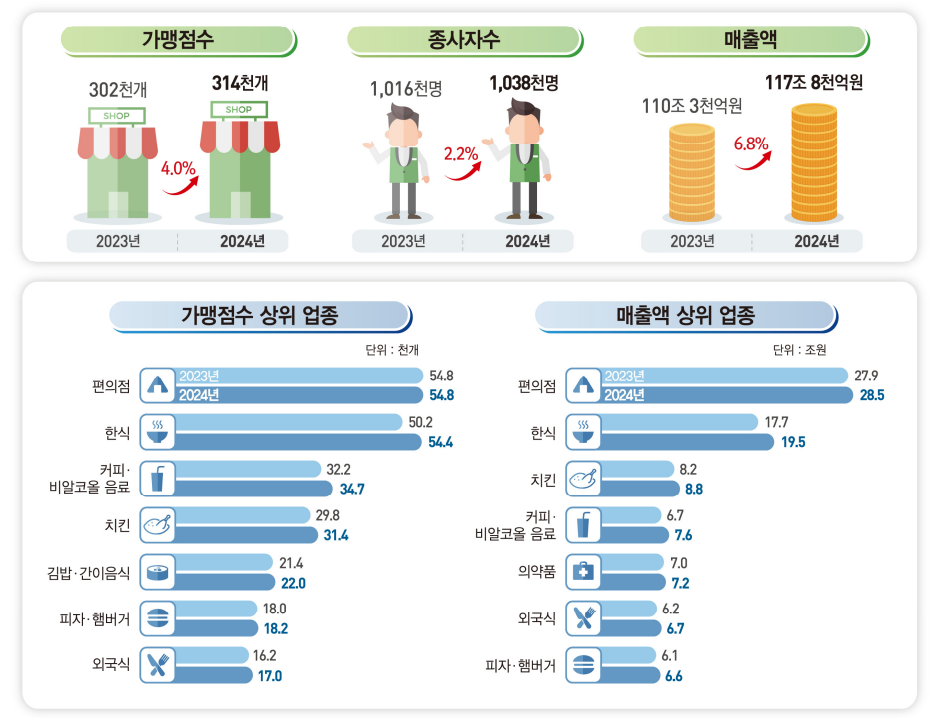 국가데이터처 관계자는 “가맹점 매출액과 종사자 수는 증가하고 있지만 코로나19 팬데믹 이후 증가세가 전반적으로 둔화되고 있다”며 “내수 경기 회복 지연과 자영업 경영 환경 악화가 프랜차이즈 업계 전반에 영향을 미친 것으로 보인다”고 말했다.