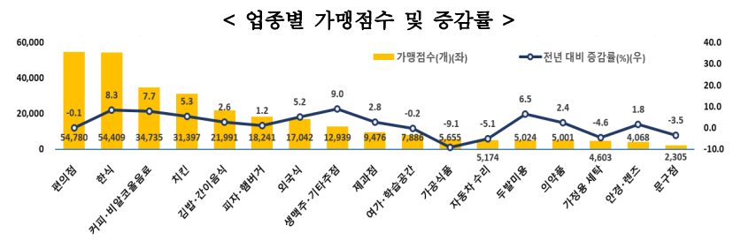 전체 프랜차이즈 시장을 보면 지난해 가맹점 수는 31만 4,000개로 전년 대비 4.0% 증가했다. 생맥주·기타주점(9.0%), 한식(8.3%), 커피·비알코올음료(7.7%) 업종에서 가맹점 수가 늘어났다. 외식업종 중에서는 한식 가맹점이 54만 4,000개로 가장 많았고, 커피·비알코올음료(34만 7,000개), 치킨(31만 4,000개)이 뒤를 이었다.