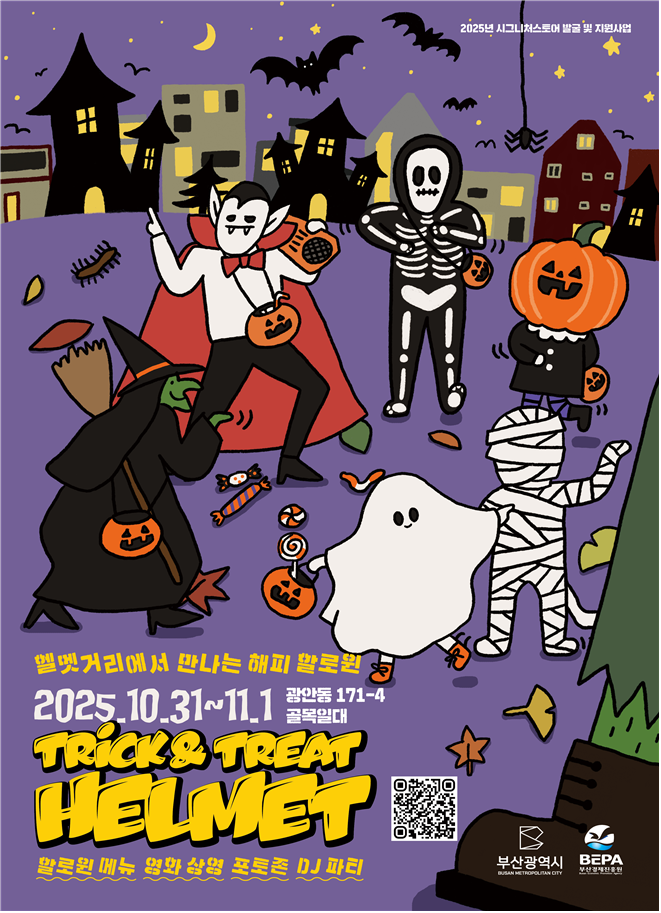 첫 번째 행사는 10월 31일부터 11월 1일까지 수영구 헬멧 골목상권(수영로554번가길 22 일원)에서 ‘헬멧거리에서 만나는 해피 핼러윈’이라는 이름으로 열린다. 광안리의 감성 브런치 카페 ‘헬멧’을 중심으로 골목 상점들이 함께 참여해 ▲핼러윈 포토존 ▲시즌 맞춤 시그니처 메뉴 출시 ▲샵인샵(가게 안 가게) 협업 프로그램 등을 진행한다. 행사 이후에도 ▲요가 클래스 ▲골목 영화 상영 ▲독서모임 등 일상 속 문화 프로그램이 11월 한 달간 이어질 예정이다.