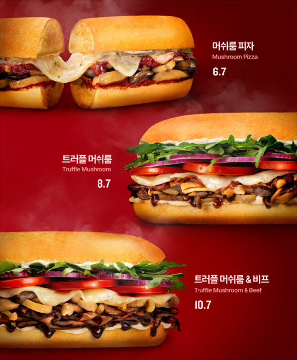 신메뉴는 ▲트러플 머쉬룸 ▲트러플 머쉬룸&비프 ▲머쉬룸 피자 총 3종으로 구성됐다. ‘트러플 머쉬룸’은 캐러멜 어니언의 단맛과 트러플 향, 루꼴라의 산뜻함이 조화를 이루며 담백하면서도 풍성한 맛을 구현했다. ‘트러플 머쉬룸&비프’는 네 종류의 버섯과 로스트 비프를 함께 담아 묵직한 감칠맛을 완성한 메뉴다. ‘머쉬룸 피자’는 모짜렐라와 마리나라 소스를 더해 피자스타일 샌드위치로, 진한 치즈 풍미를 원하는 고객에게 적합하다.