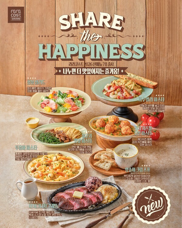 [Cook&Chef = 김세온 기자] 국내 패밀리레스토랑 프랜차이즈 라라코스트가 2026년 첫 신메뉴 7종을 출시하며 메뉴 경쟁력 강화에 나섰다.