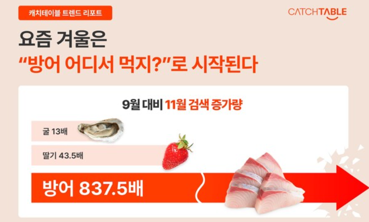 외식 예약 플랫폼 캐치테이블이 지난달 공개한 트렌드 리포트에 따르면, 방어’, ‘대방어’, ‘방어회’ 등의 검색량이 2024년 9월 대비 11월에 무려 837.5배 급증했다. 같은 기간 굴의 검색량은 13배 증가하는 등 전반적으로 겨울철 대표 식재료에 대한 관심이 확산된 것을 볼 수 있다.