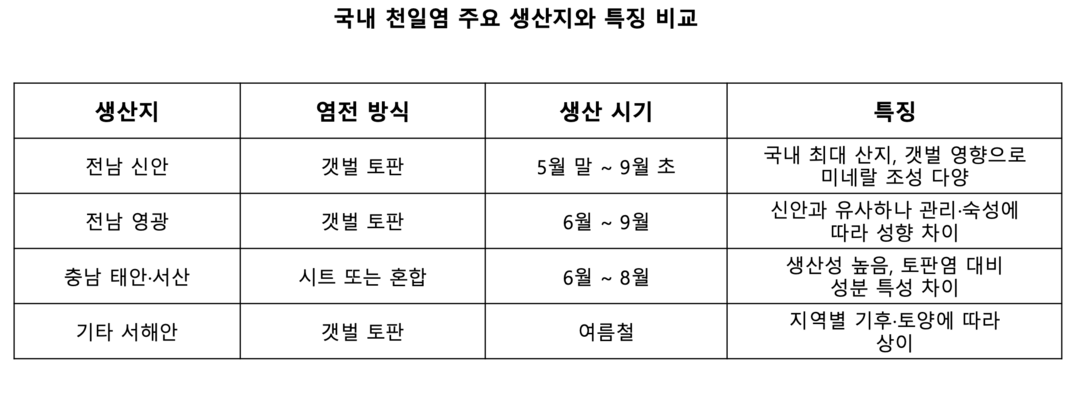 한국의 천일염 역시 모든 해안에서 생산되지 않는다. 국내 천일염은 조수 간만의 차가 크고 갯벌이 넓게 발달한 서해안을 중심으로 형성돼 왔다. 이 갯벌 환경은 한국 천일염을 하나의 특징적인 소금, 즉 갯벌 기반 천일염으로 만들었다.