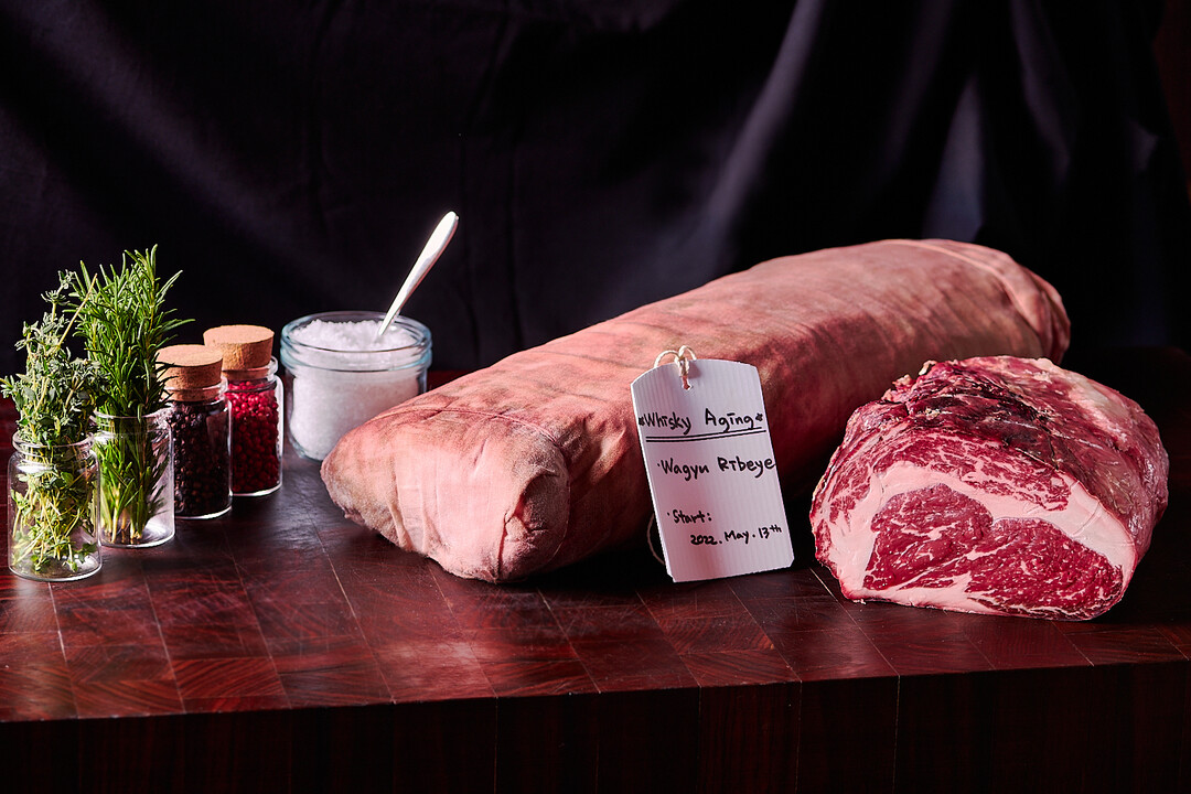 150일간 옥수수 사료로만 키워 호르몬을 전혀 사용하지 않은 미국 중서부산 프라임 소고기는, 위스키와의 에이징을 통해 갓 구운 빵 껍질 같은 고소한 풍미를 머금는다. 한입 베어 물면 달콤한 캐러멜과 은은한 시나몬, 넛맥의 스파이스가 육즙과 어우러져 독창적인 맛의 층위를 만들어낸다. 이는 단순히 고기와 술의 조합이 아니라, 위스키가 스테이크의 깊은 풍미를 끌어내며 완성하는 새로운 장르의 페어링이라 할 수 있다.