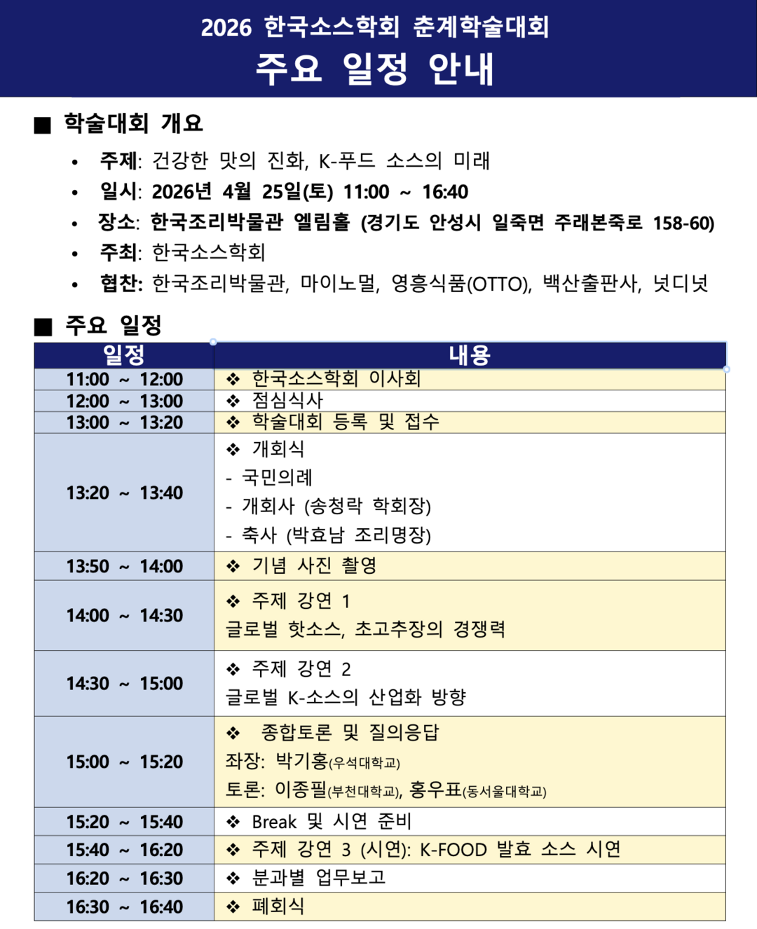 이번 행사는 학계와 산업 현장이 함께 참여하는 구조로 진행된다. 이를 통해 소스를 중심으로 한 연구와 산업 간의 연계를 강화하고, 향후 K-푸드 소스 산업의 방향성을 모색하는 자리가 될 것으로 보인다.