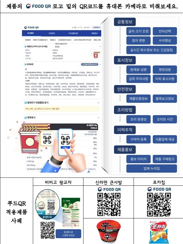 한편, 지난 8월 29일부터 시행된 「식품 등의 표시·광고에 관한 법률 시행규칙」 개정안에 따라 제품명, 소비기한, 알레르기 유발 물질 등 핵심 정보는 포장지에 눈에 잘 띄게 표시해야 하며, 그 외 정보는 푸드QR 등 전자 라벨(e-label)로 제공할 수 있다.