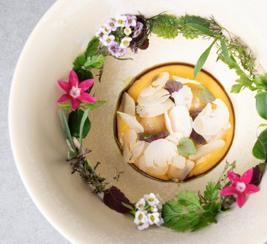 ‘비빔’이라는 한국적 개념을 현대적으로 해석한 메뉴 ‘땅콩호박과 새싹비빔’은 땅콩호박 퓨레·브라질넛·허브·보리소스 등이 섞이며 여러 층의 맛을 만들어낸다.