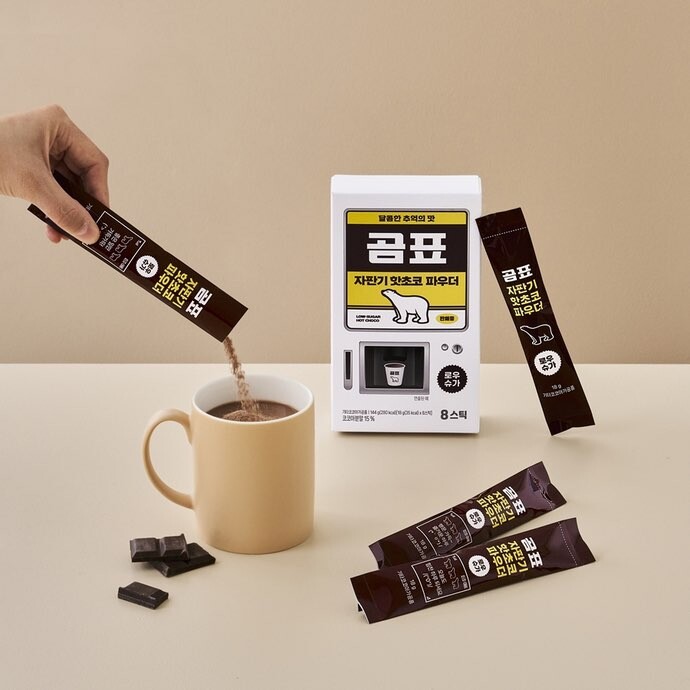 이 제품은 90~2000년대 문구점·학교·역사에서 마셨던 ‘자판기 핫초코’ 특유의 달콤한 맛을 현대적으로 재해석했다. 뜨거운 물만 있으면 바로 만들어지는 간편한 파우더 제품으로, 저당 설계로 당 부담을 줄이면서도 코코아 본연의 깊고 진한 풍미를 유지했다. 개별 스틱 포장으로 휴대성과 보관성도 뛰어나며, ‘좋은 일만 가득!’ 같은 랜덤 응원 문구가 새겨져 있어 선물용으로도 손색이 없다.