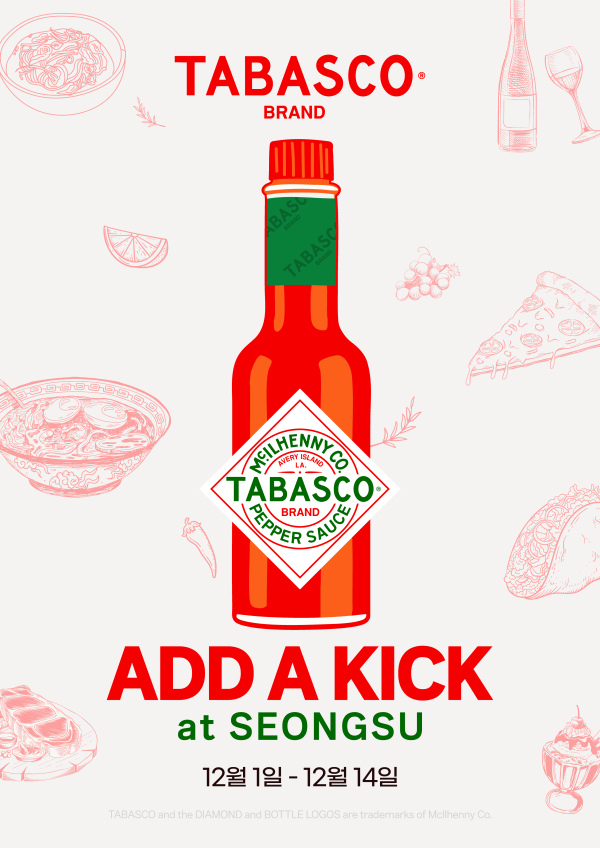 ‘Add a Kick at SEONGSU’는 타바스코®의 6종 소스와 어울리는 메뉴를 지역 맛집과 함께 선보이는 프로그램으로, 피자·멕시칸·굴·아시안·양식 등 기존 타바스코 소스와 궁합이 좋은 메뉴뿐 아니라 젤라또와 칵테일 등 이색 조합까지 참여해 더욱 이색적이고 폭넓은 경험을 제공한다. 매장별로 타바스코 소스를 활용한 창의적인 메뉴를 선보일 예정이다.