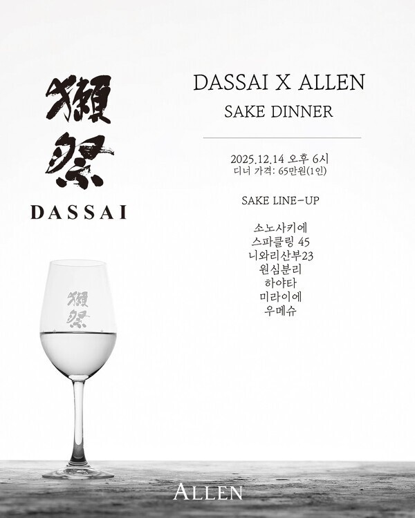 이번 디너는 국내에서 평소 접하기 어려운 사케 닷사이 7종을 한 자리에서 맛볼 수 있는 단독 사케 페어링 행사로, 알렌의 오너셰프 서현민 셰프가 한국 제철 식재료를 중심으로 닷사이의 섬세한 향과 질감을 극대화하는 코스를 선보인다. 일본 사케와 한국 파인다이닝의 조합을 통해 새로운 미식 경험을 제안하는 것이 취지다.