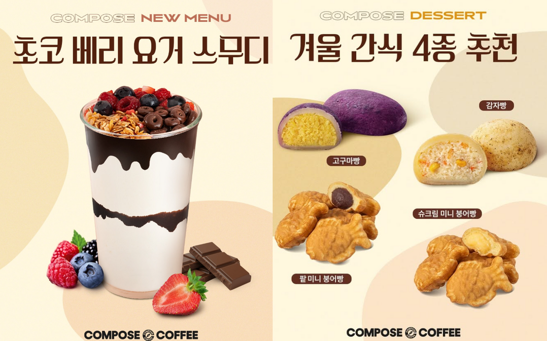 컴포즈커피는 겨울 시즌을 맞아 전통차 4종과 디저트형 음료 ‘초코베리요거스무디’를 새롭게 선보였다. 스무디에 초코쉘·초코링·그래놀라를 더해 간식처럼 즐길 수 있는 것이 특징이다.