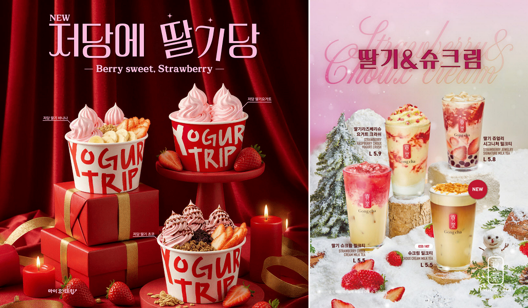 딸기 시즌의 포문은 디저트 브랜드 지난 20일 요아정이 열었다. 올해 콘셉트는 ‘베리 스윗 요아정’으로 대표 베이스 메뉴인 요거트 아이스크림에 설탕을 쓰지 않고 국내산 딸기 과육을 그대로 갈아만든 저당 딸기요거트 아이스크림을 개발해 총 12종의 시즌 라인업을 구성했다. 풍성한 생딸기 토핑과 연말 감성을 반영한 디자인으로 인증샷을 찍고 싶은 소비자들을 의식한 시즌 운영 전략이 돋보인다.
