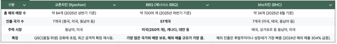 2025년, 국내 치킨 3사(BBQ·교촌·bhc)는 좁은 내수 시장을 벗어나 글로벌 영토 확장에 사활을 걸고 있다. 흥미로운 점은 3사가 택한 ‘승리 공식’이 저마다 다르다는 것이다.