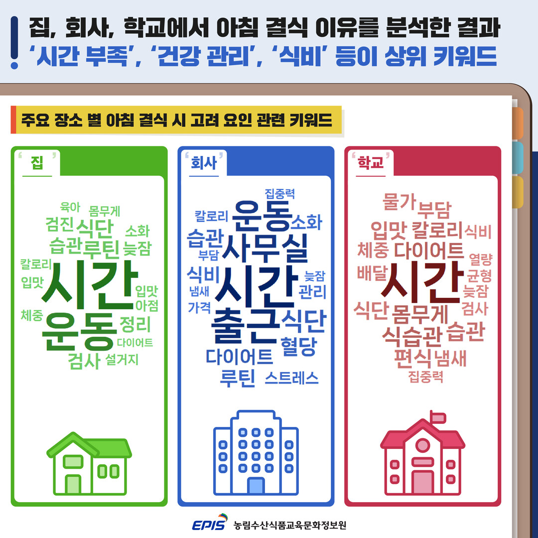 특히 ‘집·회사·학교’ 등 생활 공간에 따라 아침 결식의 맥락이 다르다는 점도 밝혀냈다. 집에서는 정리·설거지·육아 등 가사 노동과 돌봄 부담이, 회사에서는 사무실 환경과 집중력, 소화 문제가 결식에 영향을 미쳤으며, 모든 공간에서 공통적으로 시간 부족과 건강 관리 이슈가 작용했다.