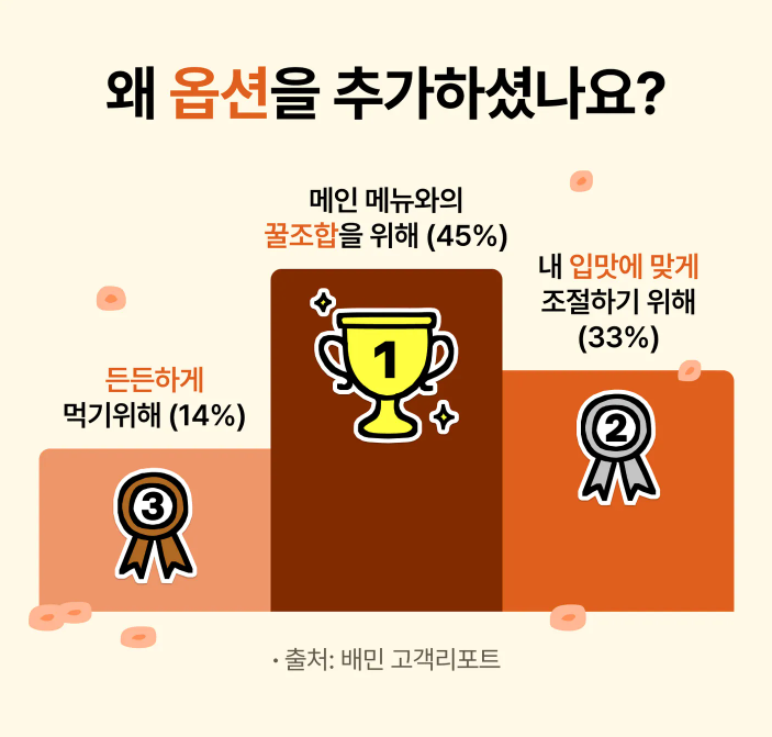 배달 시장에서도 미식의 일상화는 ‘옵션 선택’으로 구현되고 있다. 고객의 절반이 옵션을 추가하며, 지출 비용도 매년 상승 중이다. ‘한우 안심 추가 짜장면’, ‘전복 추가 갈비탕’처럼 프리미엄 선택지 한 가지로 미식 경험을 완성하는 방식이 앞으로 더욱 확산될 전망이다.